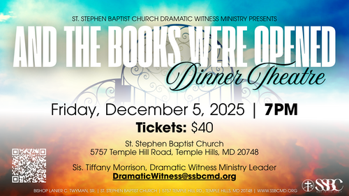 Join us for a night at the theater for Dramatic Witness' presentation of "And the Books Were Opened". Dinner will be served. Tickets are available for $40 each.